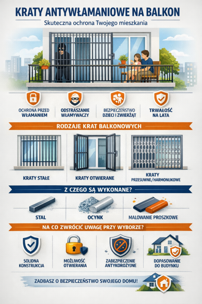 Balkon to jedno z najczęściej wykorzystywanych miejsc przez włamywaczy do dostania się do mieszkania. Dotyczy to szczególnie mieszkań na parterze, pierwszym piętrze oraz budynków z łatwym dostępem od strony ogrodu lub dachu garażu. Jednym z najskuteczniejszych sposobów zabezpieczenia balkonu są kraty antywłamaniowe, które stanowią fizyczną barierę uniemożliwiającą dostanie się do środka.